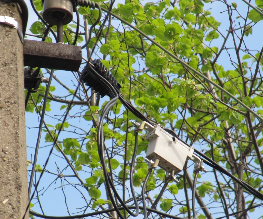 - монтаж на опоре в разрыв несущего провода в недосягаемости абонента;