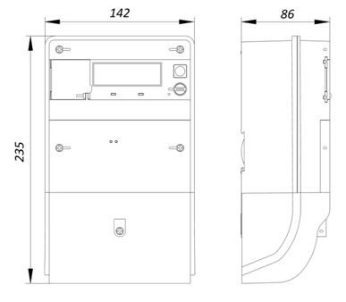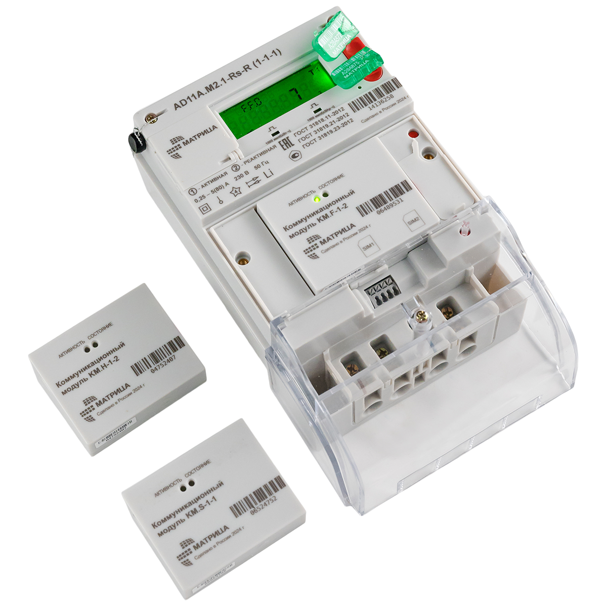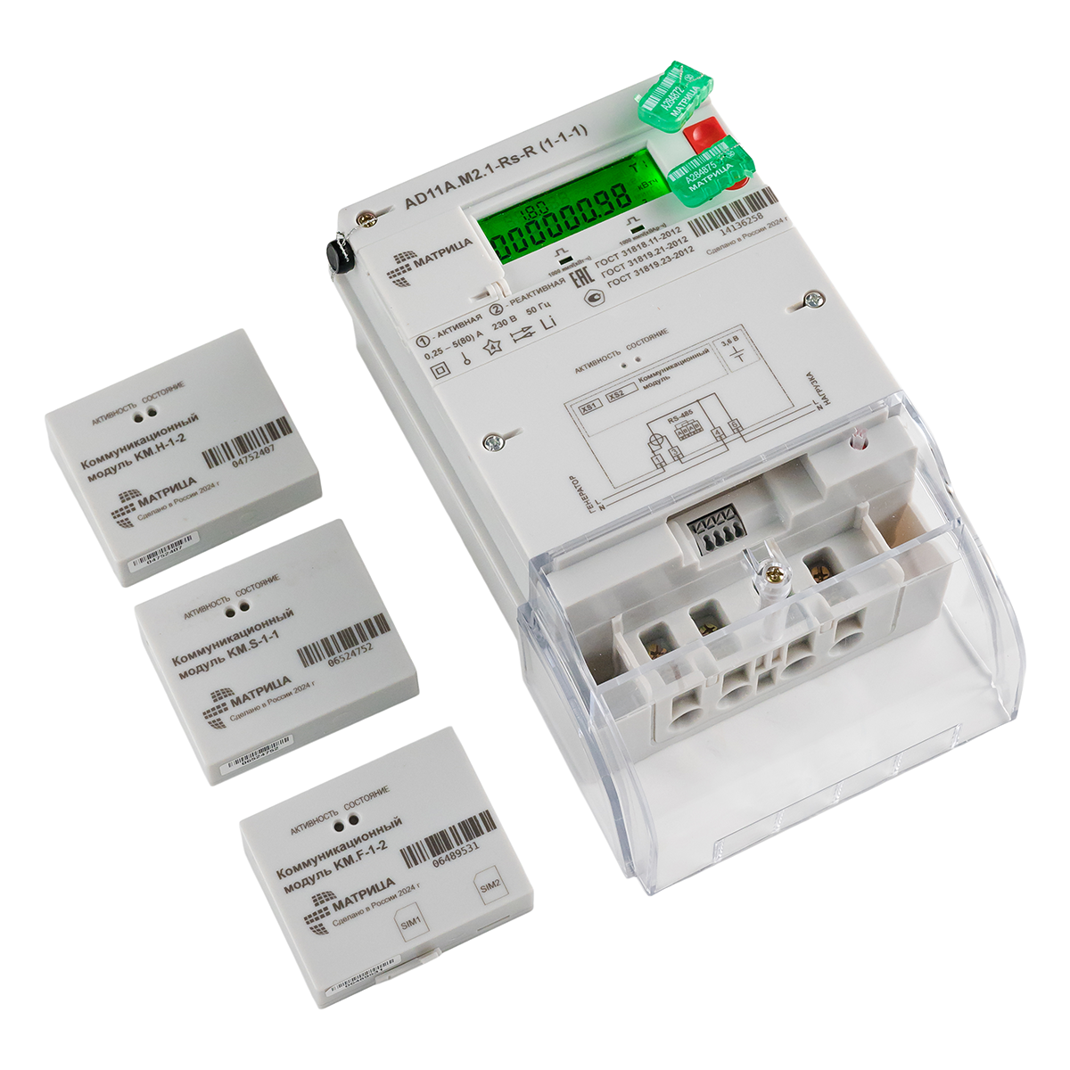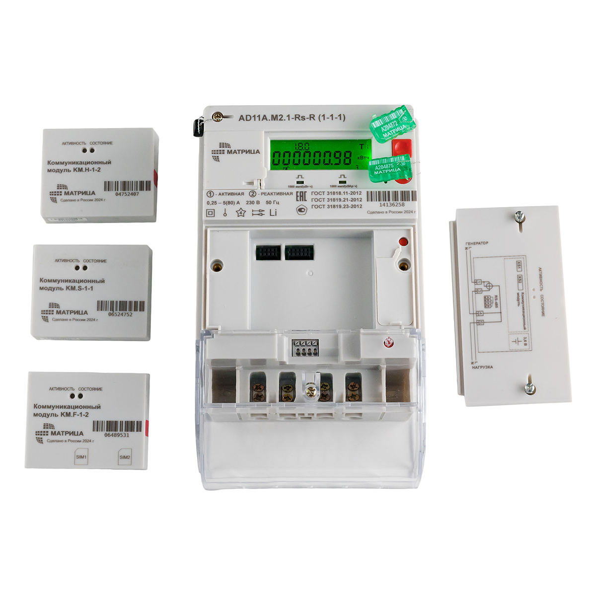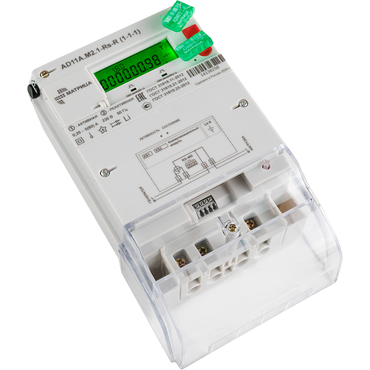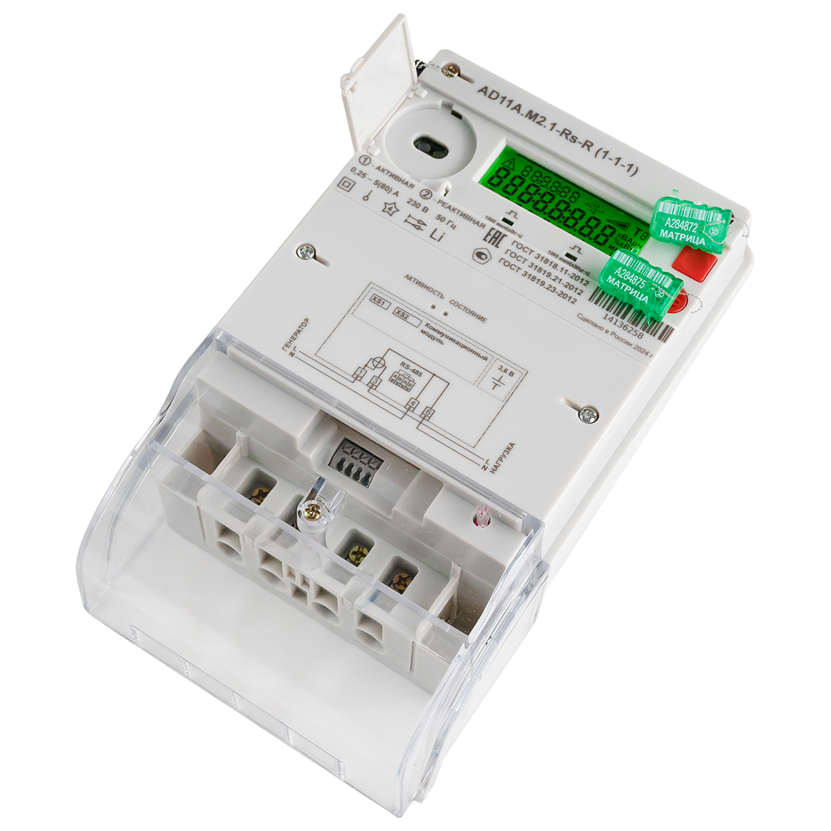 AD11A.M2.1-Rs-R (1-1-1) – счётчик электрической энергии однофазный статический двунаправленный. Обеспечивает измерение активной и реактивной электрической энергии и значений следующих параметров потребления электроэнергии: активной, реактивной и полной мощности, действующих значений фазного напряжения, фазного тока, тока нейтрали, разности фазного тока и тока нейтрали, коэффициента мощности, коэффициента реактивной мощности (tg φ), частоты сети, положительного и отрицательного отклонения уровня напряжения, отклонения частоты, длительности перенапряжения в однофазных двухпроводных электрических сетях переменного тока напряжением 230 В.